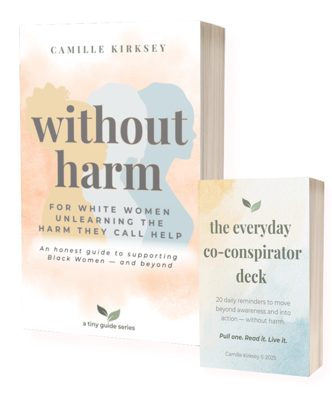 Without Harm helps white women understand how good intentions can still cause harm — and what to do differently. It bridges awareness and action, offering clarity, accountability, and a grounded way forward. The digital guide includes the Everyday Co-Conspirator Deck for simple daily practice and real, sustainable change.